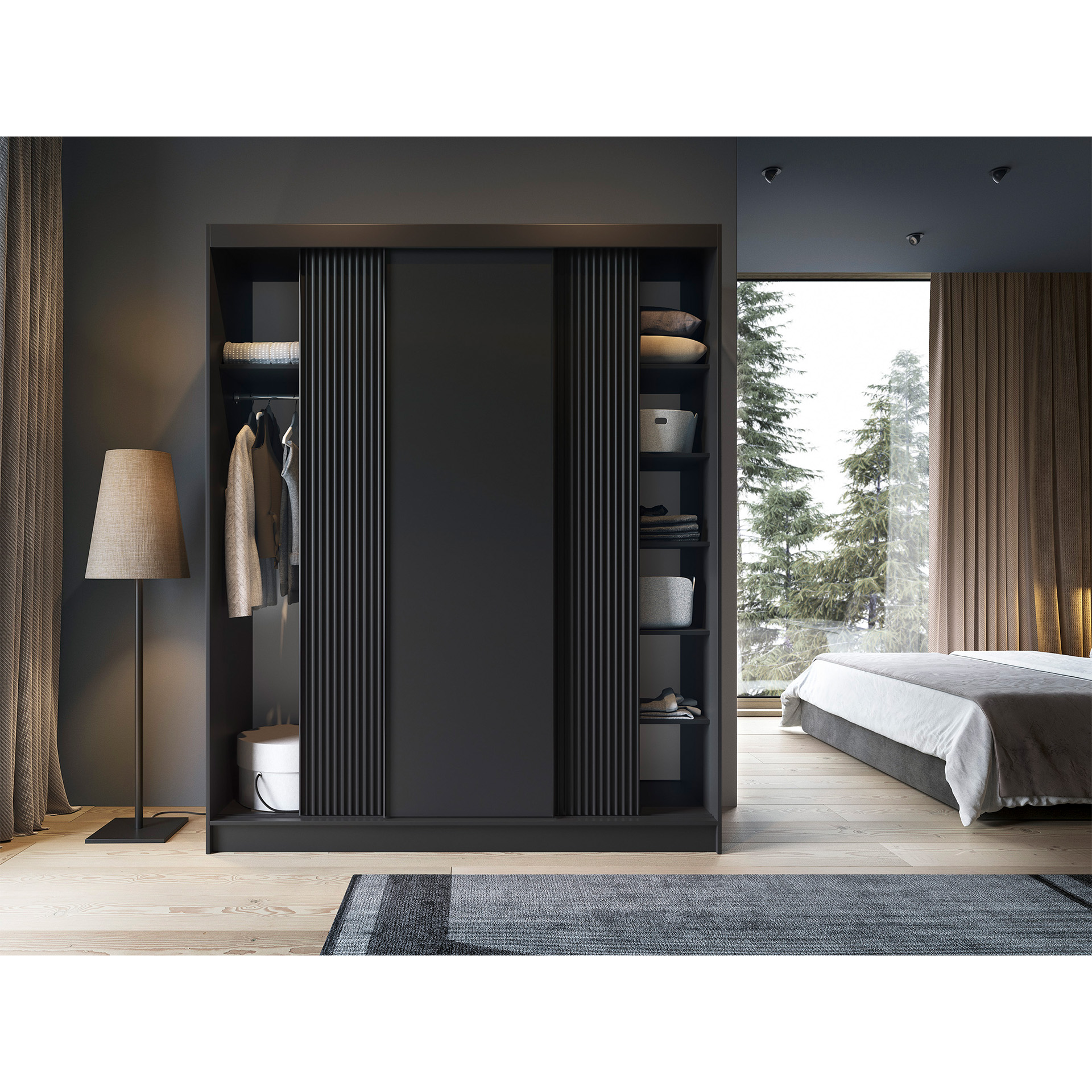 - Vnitřní uspořádání: Skříň je vybavena šatní tyčí a policemi, což umožňuje efektivní organizaci vašich věcí.