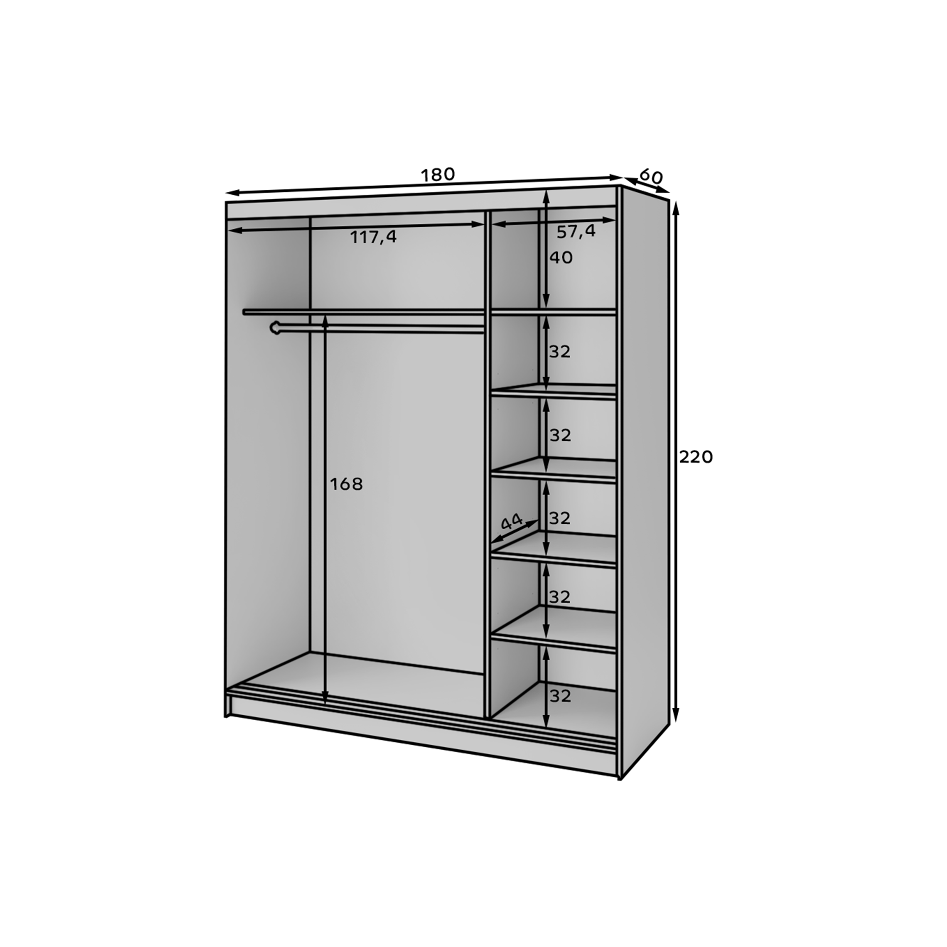 Celkové rozměry skříně jsou 220 cm na výšku, 180 cm na šířku a 60 cm na hloubku. Tloušťka desky je 16 mm, což zajišťuje stabilitu a pevnost konstrukce.