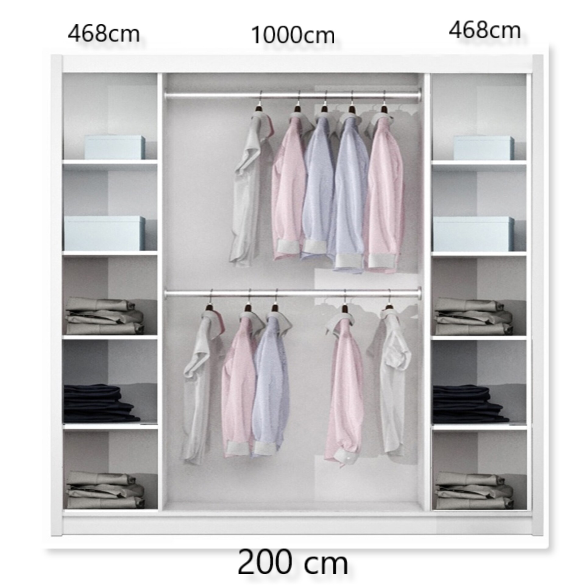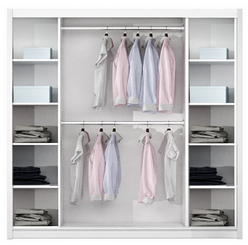 Šatní skříň Rodos nabízí praktické vnitřní uspořádání. Po levé a pravé straně se nacházejí police, zatímco ve střední části jsou umístěny dvě šatní tyče nad sebou a jedna horní police. Toto uspořádání zajišťuje maximální využití prostoru a přehlednost ve vašem oblečení.