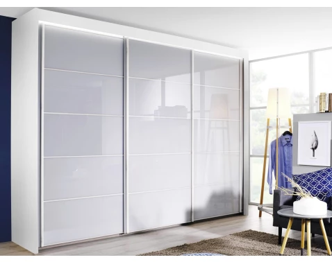 Šatní skříň s osvětlením Imperial, 300 cm, bílá/bílé sklo