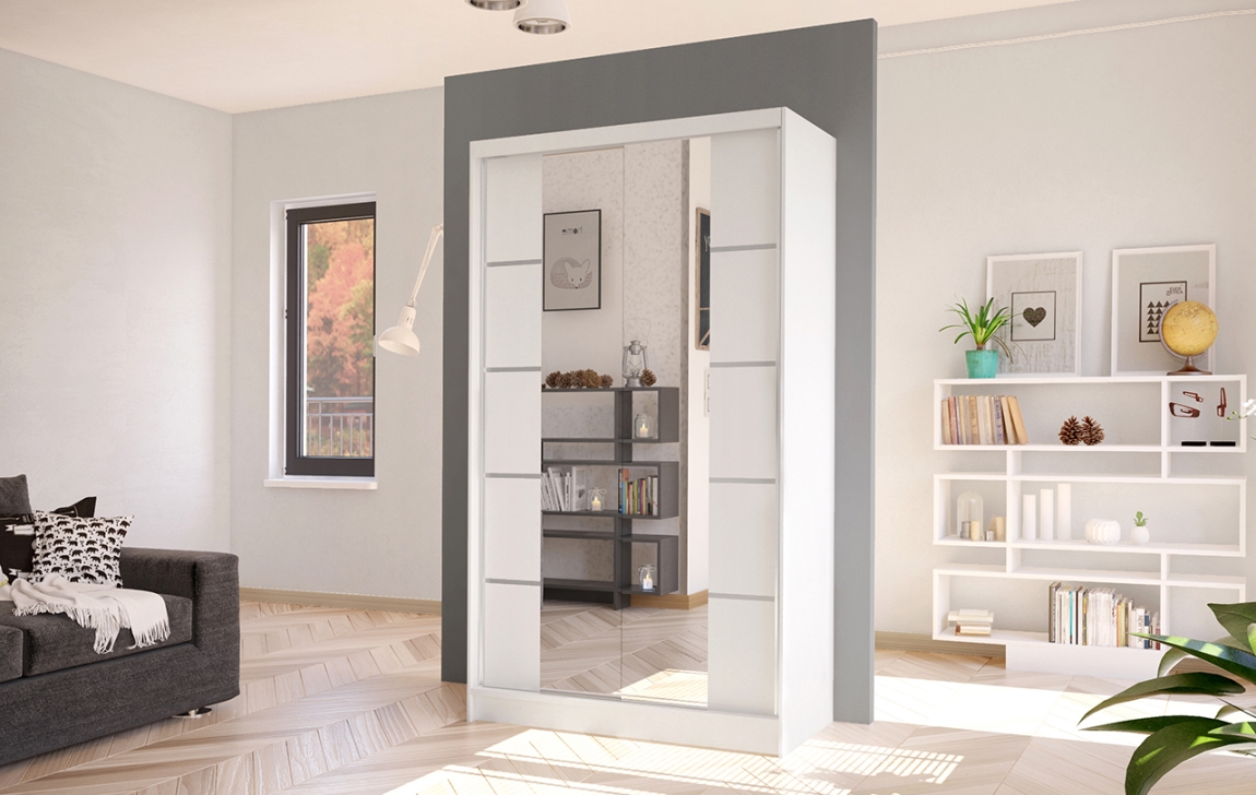 Získejte praktickou a moderní šatní skříň, která se snadno vejde do jakéhokoliv prostoru. S posuvnými dveřmi a zrcadlem bude ideálním řešením pro vaši ložnici.