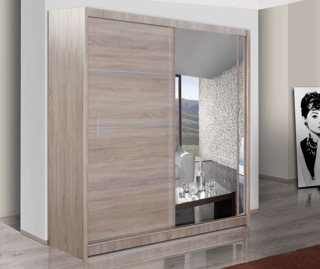 Jedním z hlavních rysů této skříně je velké zrcadlo, které opticky zvětšuje prostor a zároveň vám poskytne skvělý přehled o vašem outfitu. Zrcadlo je umístěno na přední straně skříně, což zajišťuje jak funkčnost, tak estetiku.