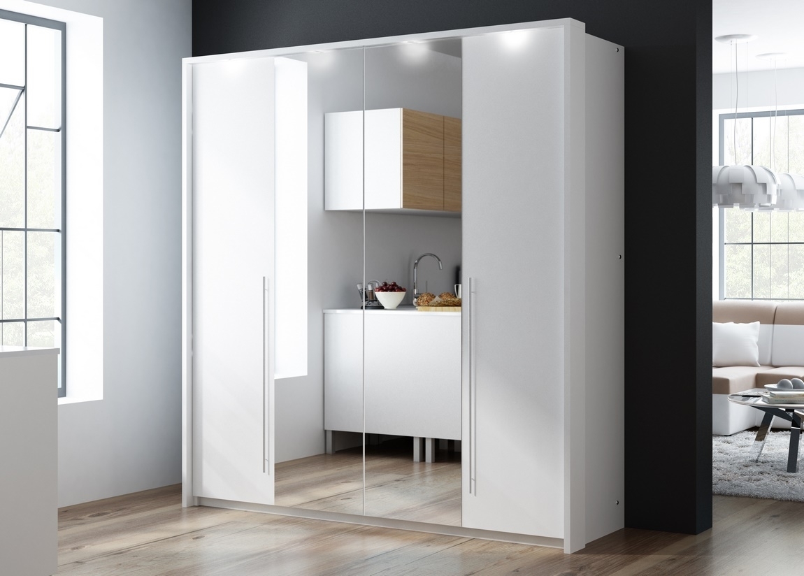 Skříň je vybavena křídlovými shrnovacími dveřmi, které zajišťují volný přístup do celé skříně. Tento systém dveří je nejen praktický, ale také přispívá k celkovému modernímu vzhledu skříně. Dveře jsou v bílé barvě a jsou elegantně doplněny zrcadlem, které opticky zvětšuje prostor a přidává na atraktivitě.