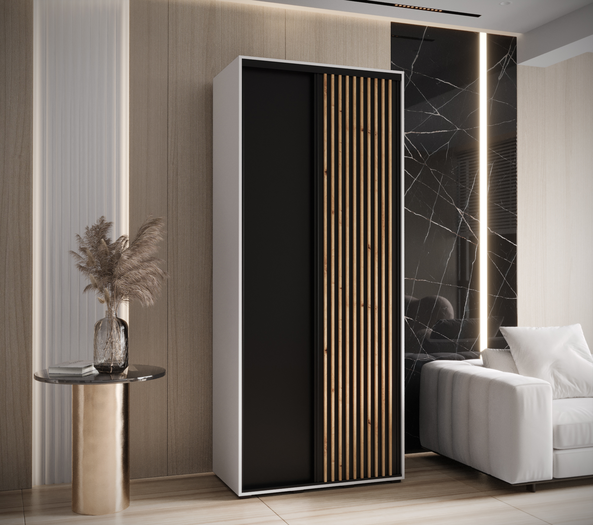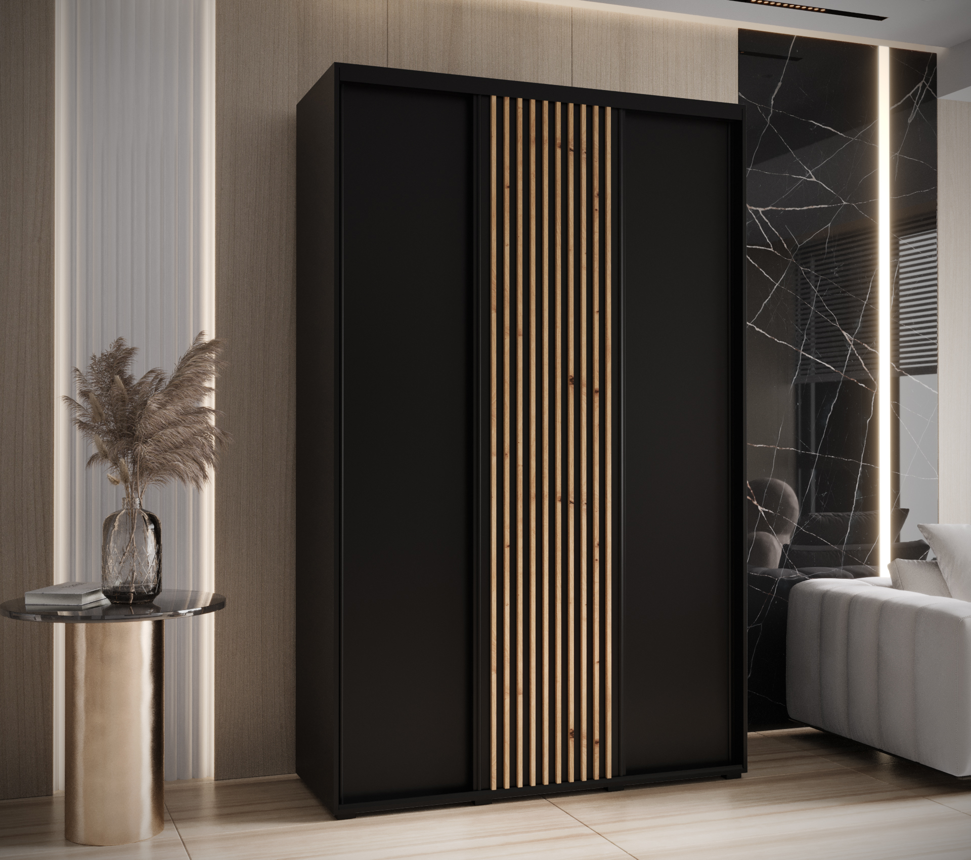 - Estetické prvky: Posuvné dveře jsou zdobeny plastovými lamelami, které dodávají skříni elegantní vzhled.