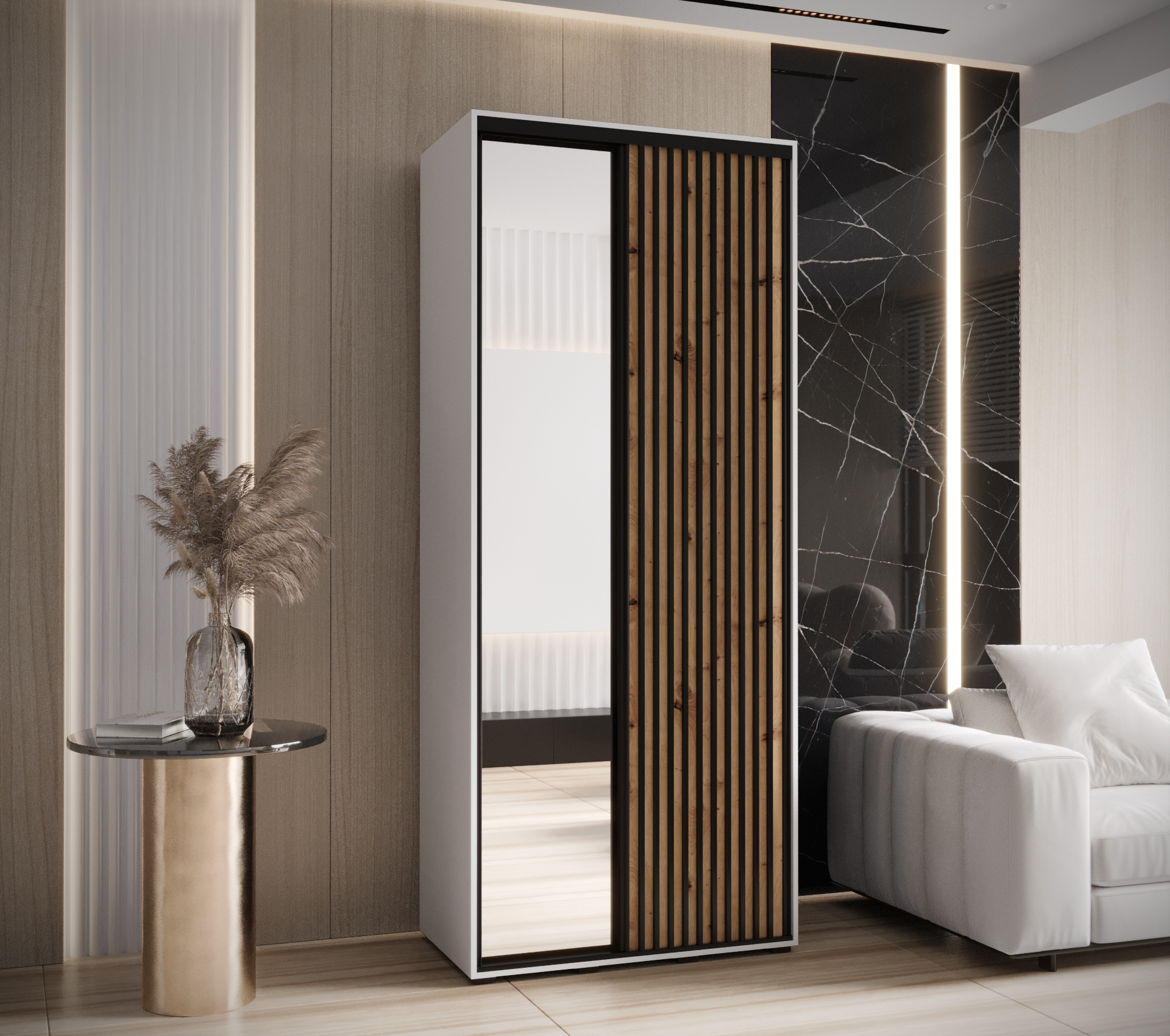 Šatní skříň Sapporo 2 je k dispozici v různých barevných kombinacích. Korpus může být ve variantě bílá nebo dub artisan, zatímco dveře jsou dostupné v černé barvě. Je důležité poznamenat, že ozdobné lamely v odstínu dub artisan nelze kombinovat s bílými dveřmi.