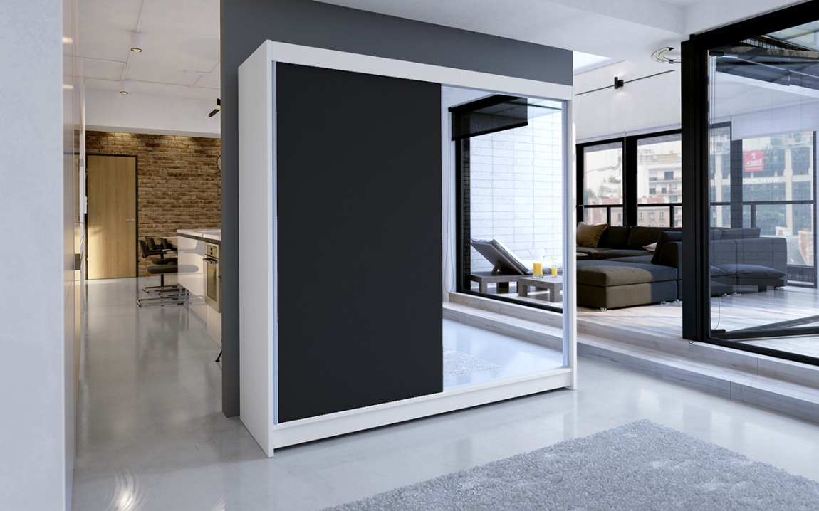 Šatní skříň se zrcadlem NUDICAULIS I v elegantní kombinaci bílé a černé barvy je skvělým řešením pro každou moderní domácnost. S rozměry 180 x 58 x 215 cm poskytuje dostatek prostoru pro uložení oblečení a dalších věcí, které potřebujete mít po ruce.