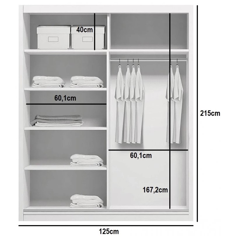 Skříň je vybavena moderním systémem posuvných dveří Bimak, který zajišťuje tichý a plynulý pohyb. Dveře se snadno otevírají a zavírají bez viditelného kování, což dodává skříni elegantní vzhled.