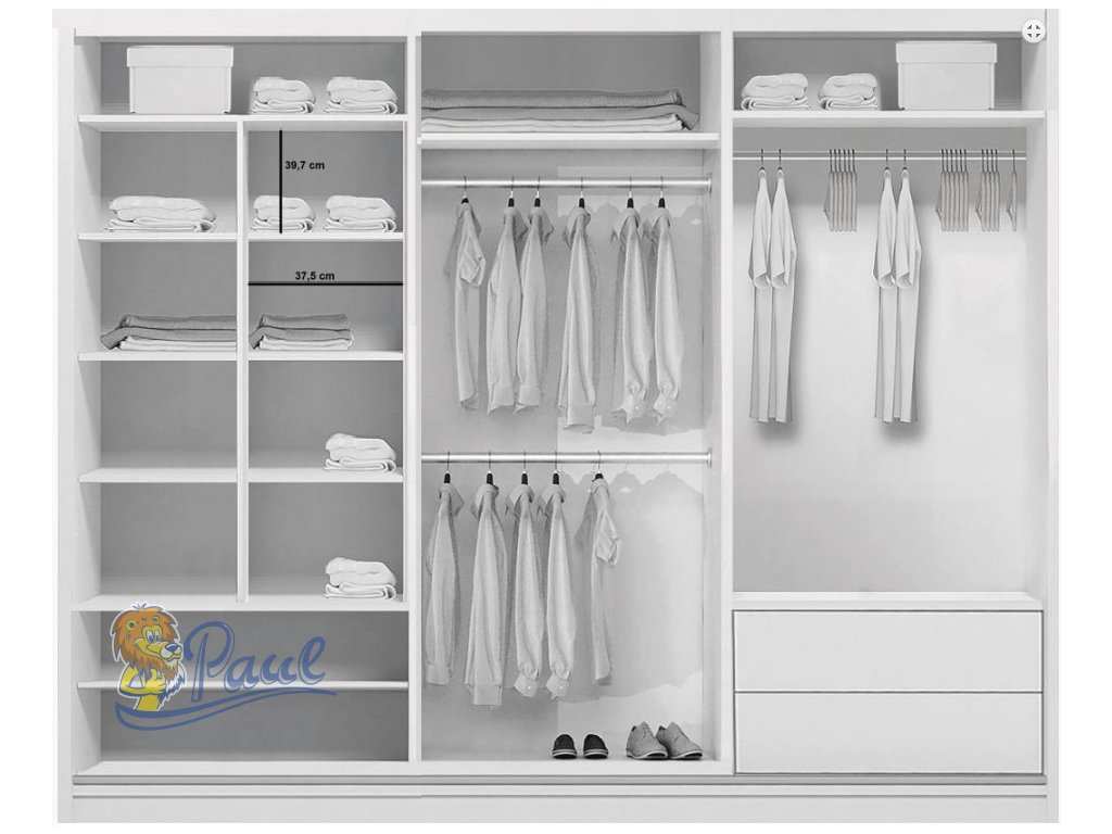 Celková výška skříně je 245 cm, šířka 278 cm a hloubka 62 cm. Tloušťka desky je 16 mm, což zajišťuje dostatečnou stabilitu a pevnost skříně.