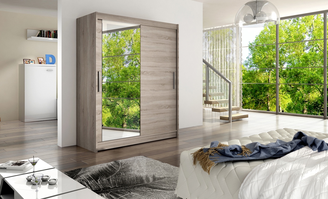 Posuvné dveře šatní skříně šetří prostor a usnadňují přístup k vašemu oblečení. Zrcadlo na dveřích je praktickým doplňkem, který opticky zvětší váš prostor a usnadní přípravu na každodenní aktivity. Kvalitní materiály zaručují dlouhou životnost a odolnost skříně.