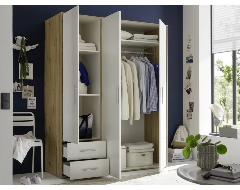 Skříň je vybavena třemi otočnými dveřmi, které zajišťují snadný přístup k obsahu. Uvnitř se nachází šatní tyč pro zavěšení oblečení a police, které umožňují efektivní organizaci vašeho šatníku. Dvě zásuvky na spodní části skříně poskytují dodatečný úložný prostor pro menší předměty, jako jsou ponožky, spodní prádlo nebo doplňky.