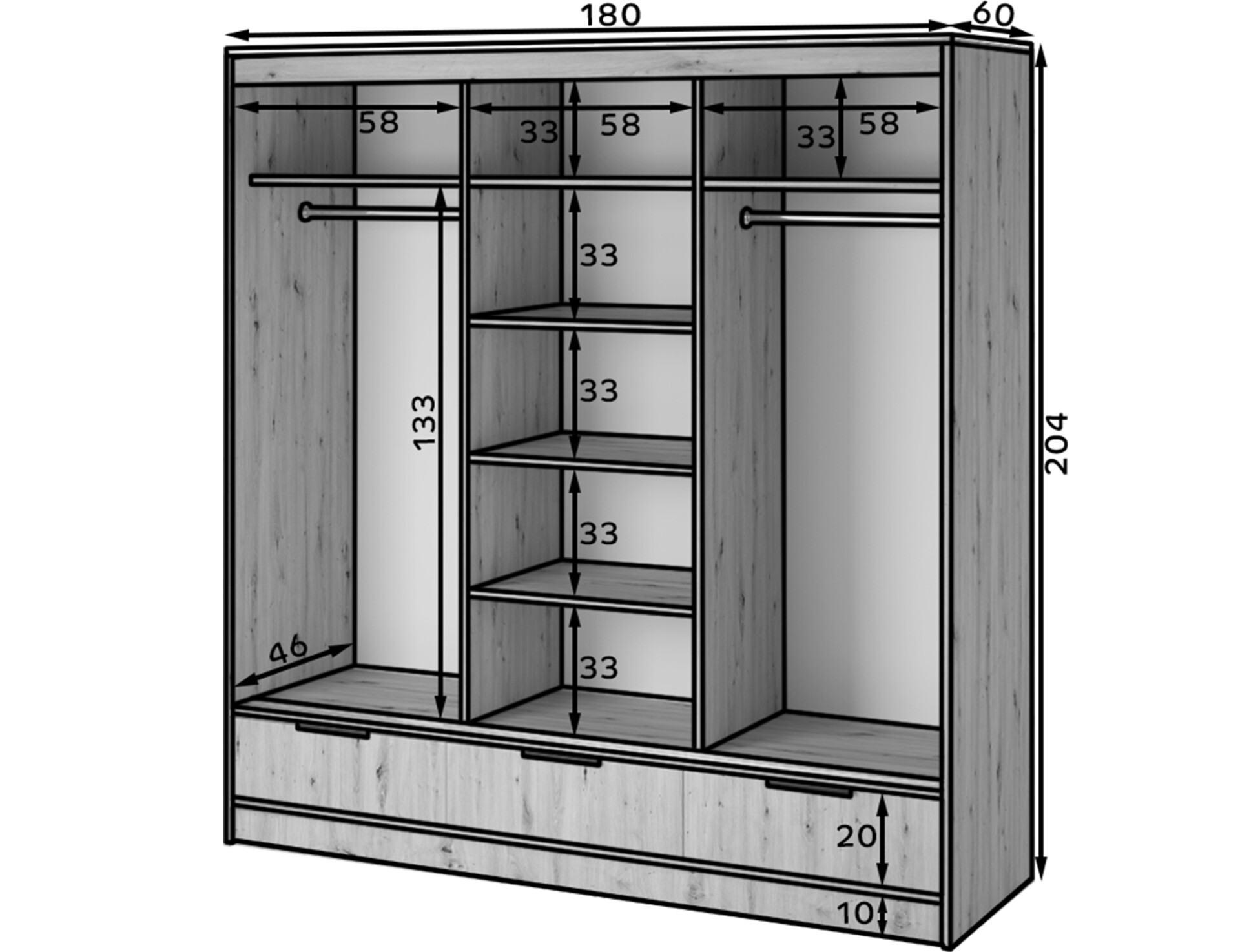 - Vnitřní uspořádání: Skříň nabízí praktické vnitřní uspořádání se dvěma šatními tyčemi, policemi a třemi spodními zásuvkami, což umožňuje efektivní organizaci oděvů a dalších věcí.
