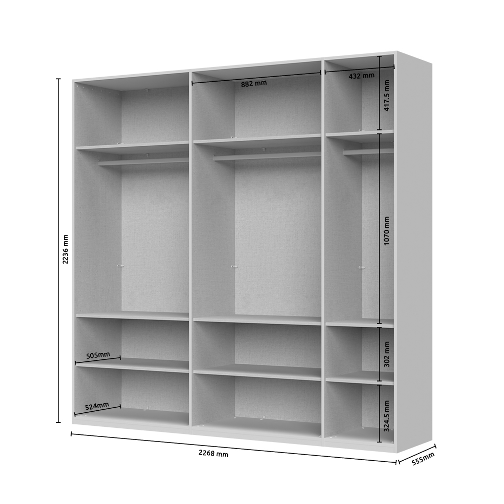 - Skříň nabízí devět polic a tři šatní tyče, což zajišťuje dostatek prostoru pro uložení oblečení a dalších předmětů.