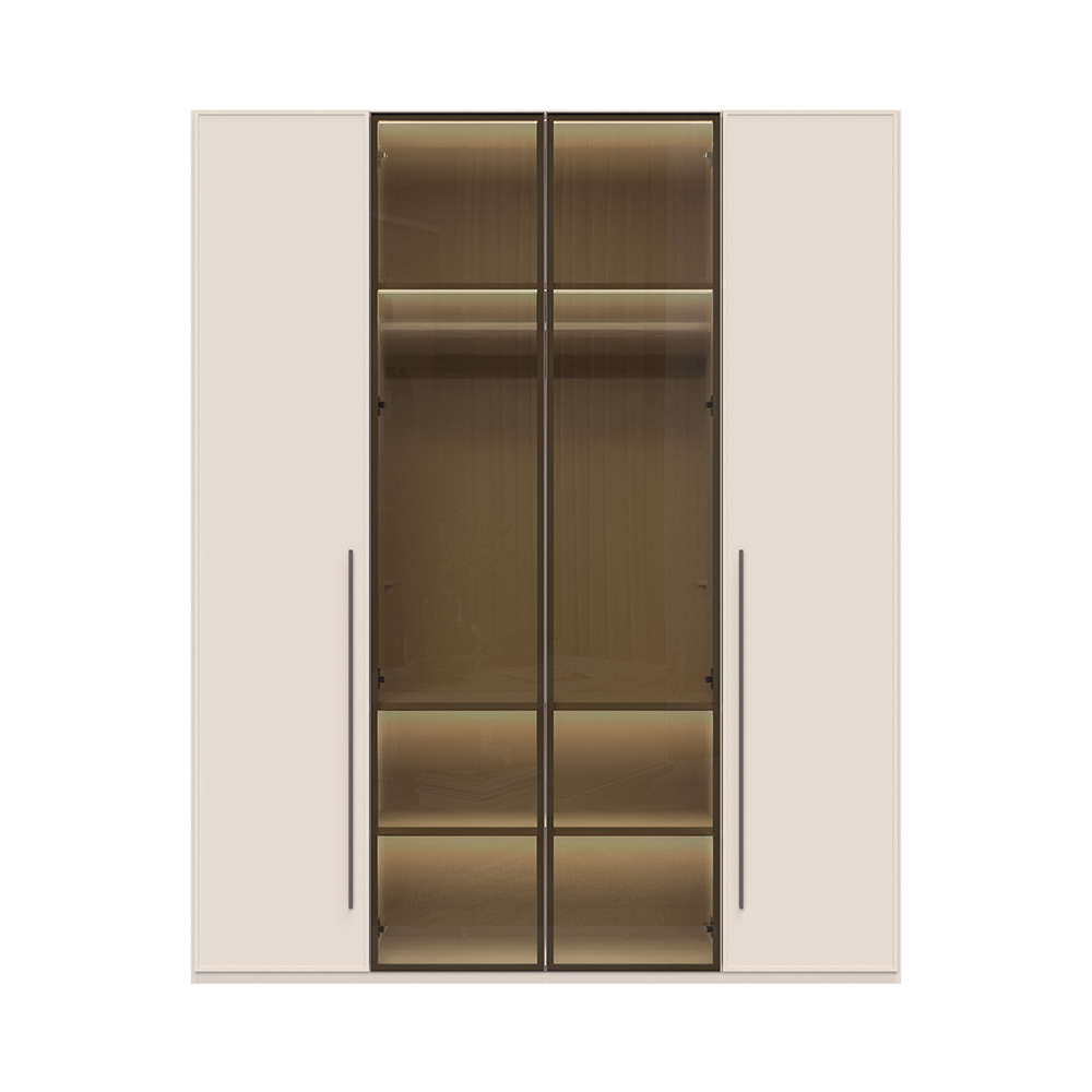 Korpus skříně a dvě křídla jsou pokryty měkkým matným UV lakem v barvě Cashmere, což dodává skříni jemný a sofistikovaný vzhled. Dvě skleněná křídla s hliníkovým rámem o tloušťce 20 mm a sklem o tloušťce 4 mm nejenže vypadají moderně, ale také poskytují skvělý přehled o uložených věcech.