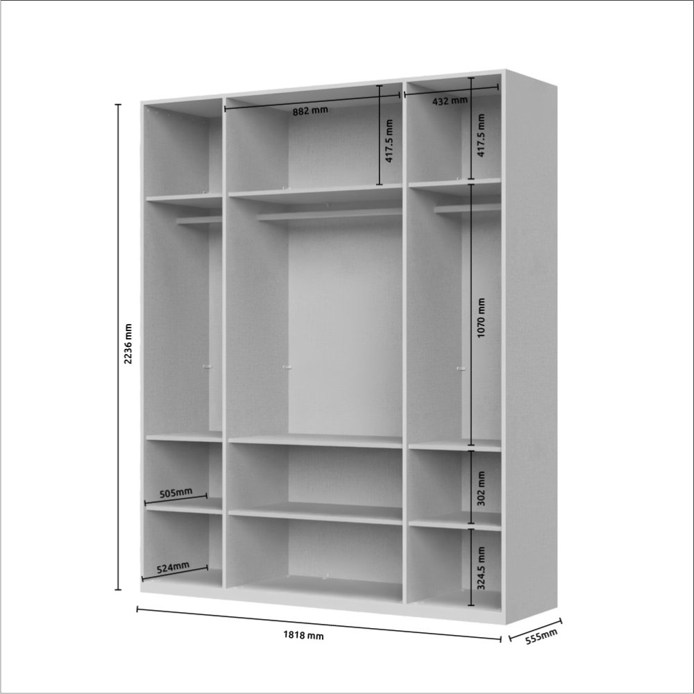 Interiér korpusu je v textilním dekoru, který dodává útulnost. Díky možnosti přídavného vybavení si můžete interiér skříně přizpůsobit podle svých potřeb, což z ní činí ideální volbu pro každého, kdo hledá flexibilní a praktické řešení pro úložný prostor.