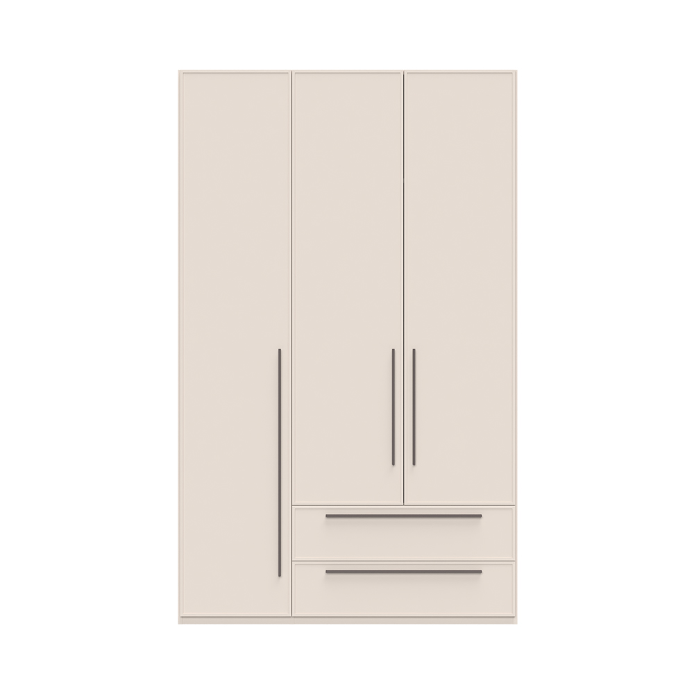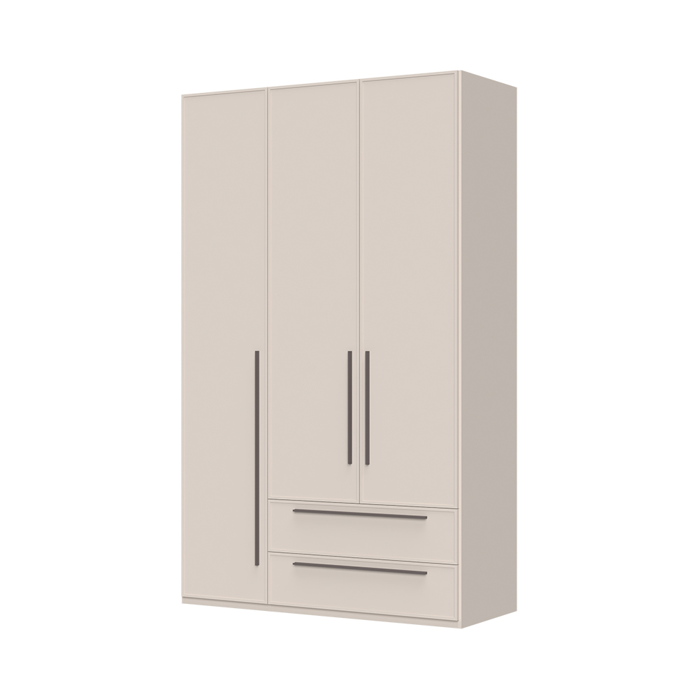 Korpus i přední strana skříně jsou pokryty měkkým matným UV lakem v atraktivní barvě Cashmere, což dodává skříni nadčasový vzhled. Přední strana skříně má tloušťku 19 mm a je doplněna dekorativním profilovaným MDF rámem, který podtrhuje estetiku celého kusu nábytku. Zadní strana korpusu je opatřena lemem na hraně, což zajišťuje vyšší odolnost a pevnost.