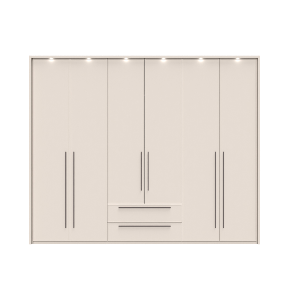Korpus skříně má tloušťku do 25 mm a je pokryt měkkým matným UV lakem v barvě Cashmere, který dodává nábytku moderní vzhled. Přední strana skříně je opatřena dekorativním profilovaným MDF rámem a má tloušťku 19 mm. Díky tomu se skříň stává nejen funkčním prvkem, ale i designovým doplňkem vašeho domova.
