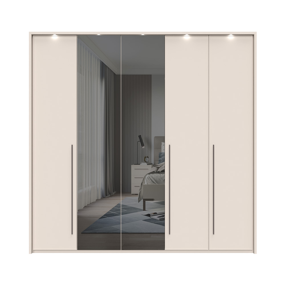 Stylová skříňová sestava OPERA v barvě Cashmere nabízí skvělý design a praktické úložné řešení. Zrcadlové dveře a osvětlení přidávají na atraktivitě.