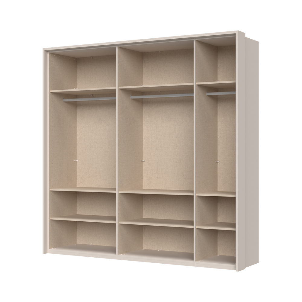 Korpus skříní je vyroben z materiálu o tloušťce do 25 mm, který je potažen měkkým matným UV lakem v barvě Cashmere. Přední strana skříní má tloušťku 19 mm a je taktéž opatřena matným UV lakem v této elegantní barvě. Dekorativní profilovaný MDF rám dodává skříním na atraktivitě a stylovosti.