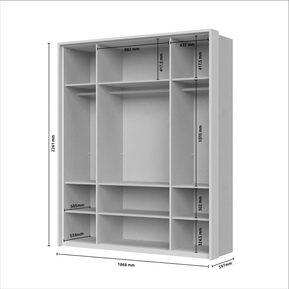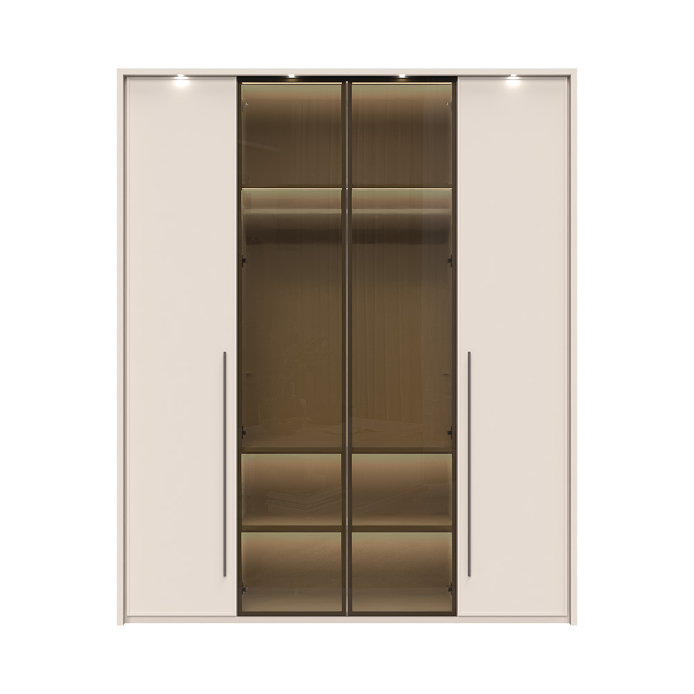 Korpus skříně je vyroben z kvalitních materiálů s tloušťkou do 25 mm, pokrytý měkkým matným UV lakem v jemné barvě Cashmere. Dveře skříně kombinují moderní skleněné prvky s hliníkovým rámem, což dodává celému kusu nábytku elegantní vzhled. Sklo má tloušťku 4 mm a hliníkový rám 20 mm, což zajišťuje nejen estetiku, ale i odolnost.