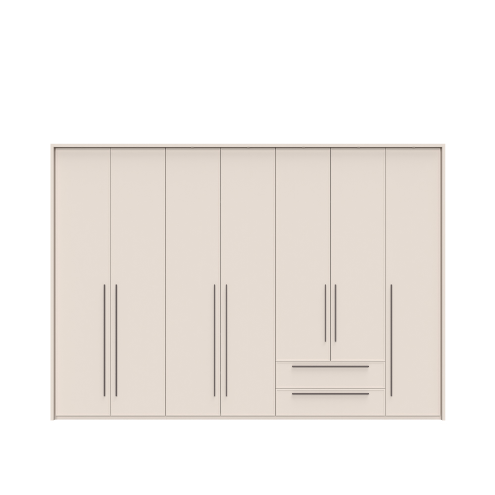 Korpus skříně je vyroben z materiálu o tloušťce do 25 mm, což zaručuje vysokou odolnost a stabilitu. Měkký matný UV lak v barvě Cashmere dodává skříni elegantní vzhled a chrání ji před poškozením. Přední strana skříně má tloušťku 19 mm a je také pokryta matným lakem, což podtrhuje její luxusní design.