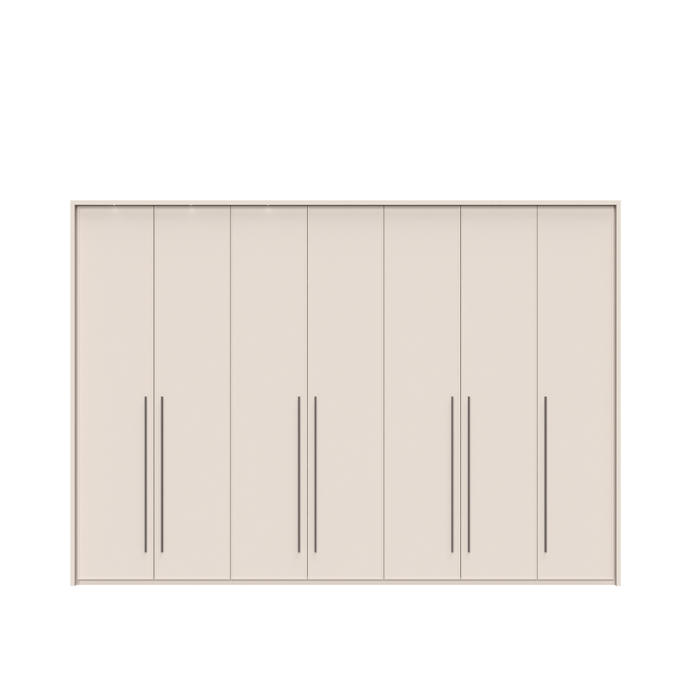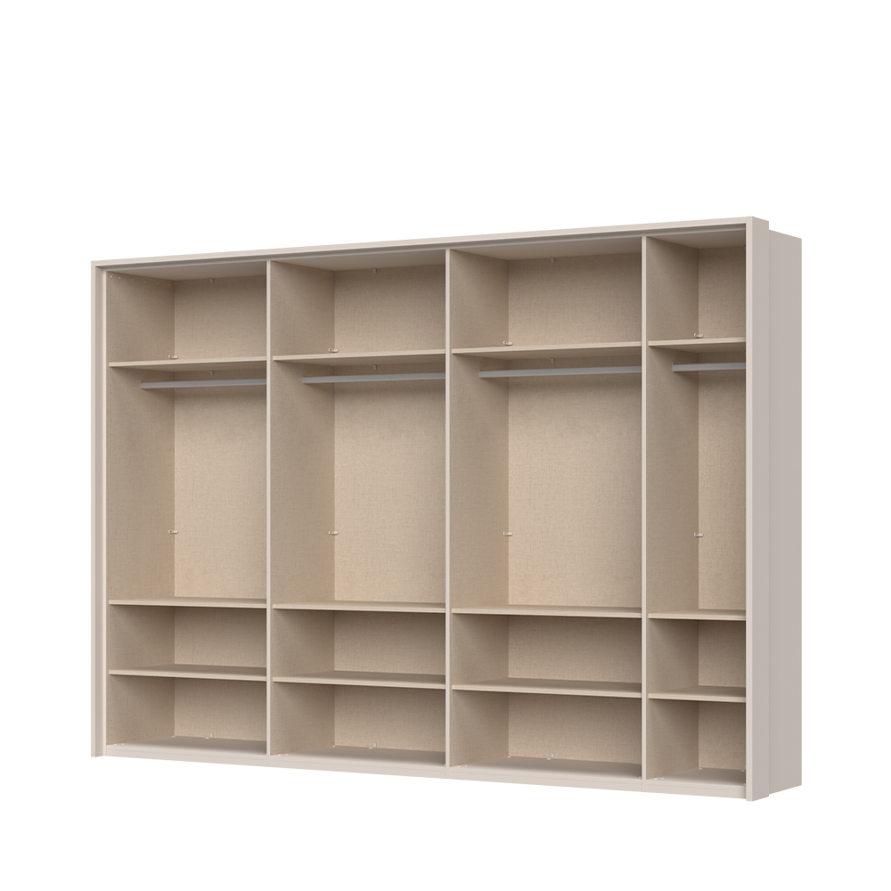 Sestava skříní OPERA je vyrobena s důrazem na kvalitu a estetiku. Korpus skříně má tloušťku do 25 mm a je potažen měkkým matným UV lakem v elegantní barvě Cashmere. Přední strana skříně, s tloušťkou 19 mm, je opatřena dekorativním profilovaným MDF rámem, který dodává celkovému vzhledu na sofistikovanosti.