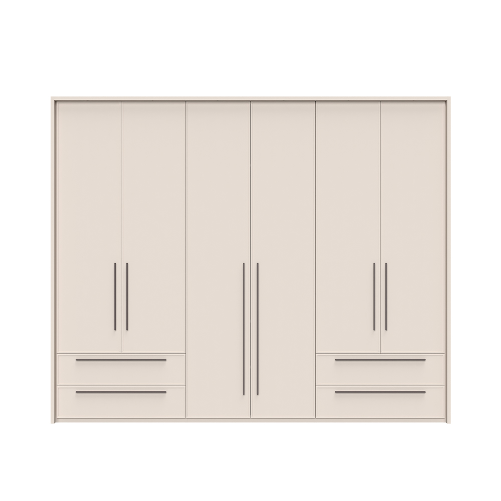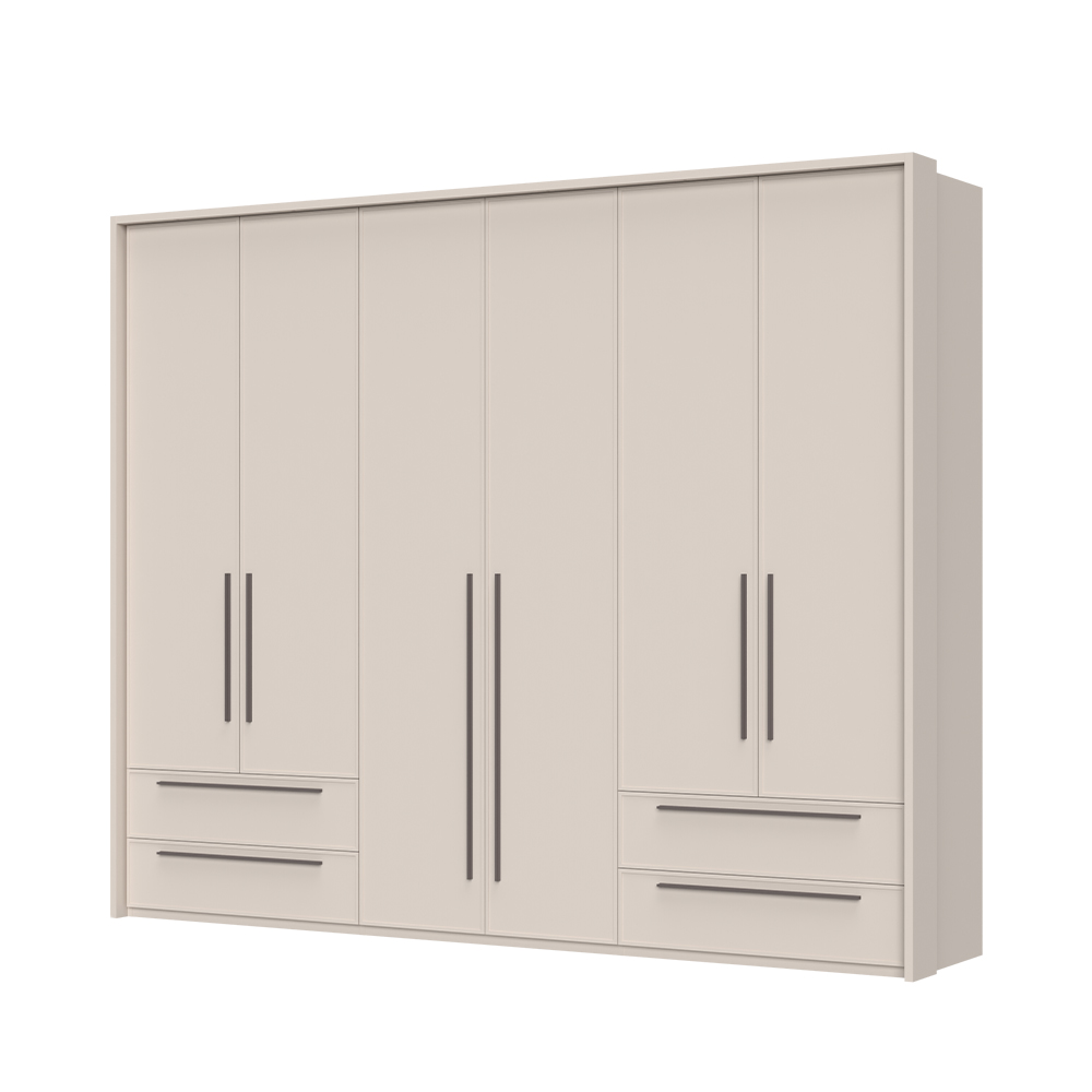 Korpus skříně je vyroben z robustního materiálu s tloušťkou do 25 mm, což zajišťuje dlouhou životnost. Měkký matný UV lak v barvě Cashmere dodává skříni moderní vzhled a navíc je snadno udržovatelný. Přední strana skříně má tloušťku 19 mm a je opatřena dekorativním profilovaným MDF rámem, který přidává na eleganci.