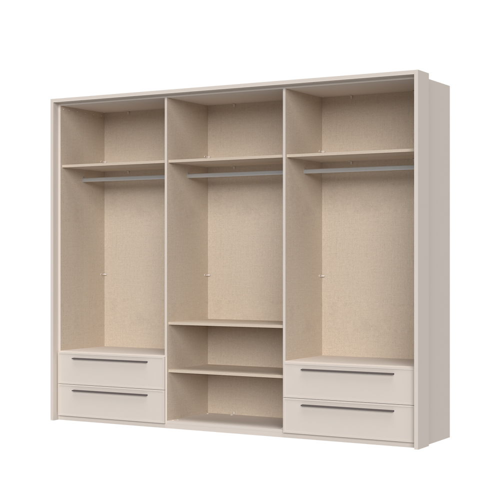 Interiér korpusu skříně je v textilním dekoru, což přidává na estetice a příjemném pocitu. Skříň obsahuje pět polic, tři šatní tyče a čtyři zásuvky, což poskytuje dostatek úložného prostoru pro vaše oblečení a další věci.