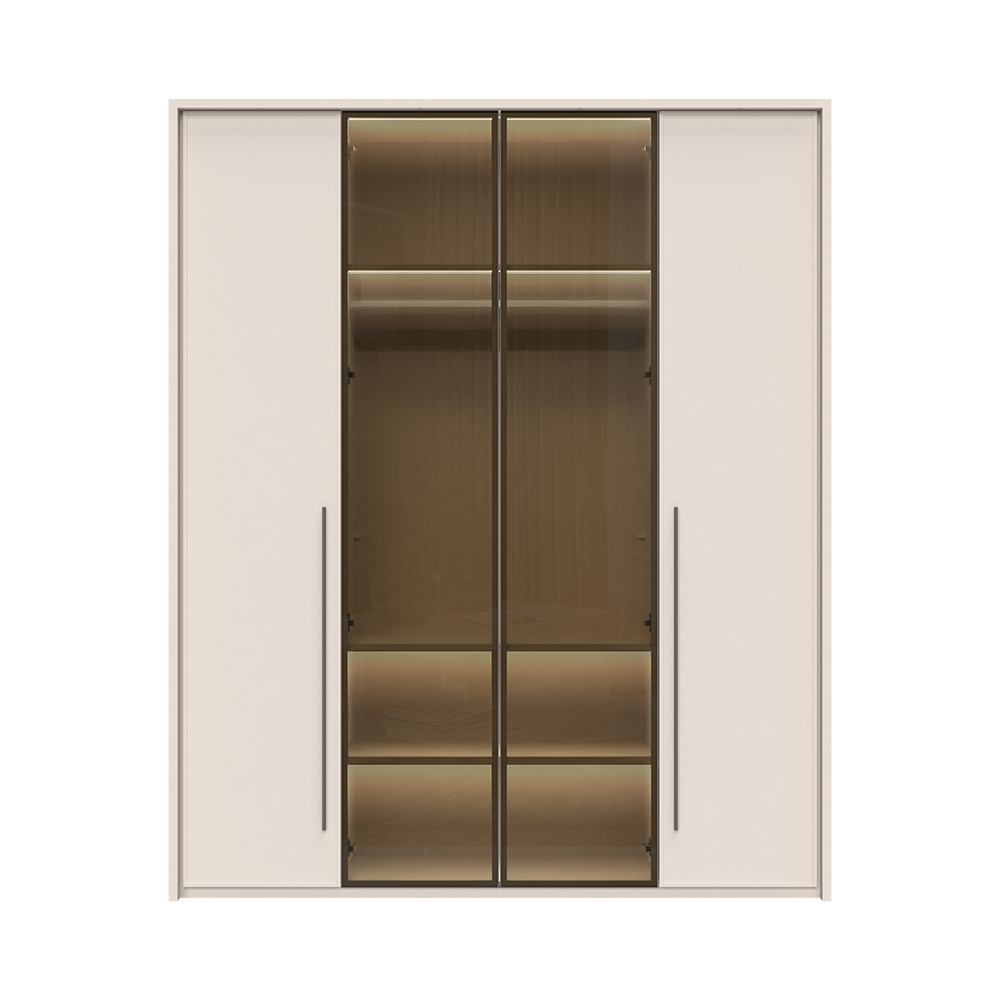 Dvě křídla skříně jsou skleněná s hliníkovým rámem, přičemž sklo má tloušťku 4 mm a hliníkový rám 20 mm. Tento design nejen že vypadá skvěle, ale také umožňuje snadný přístup k obsahu skříně, což oceníte při každodenním používání.