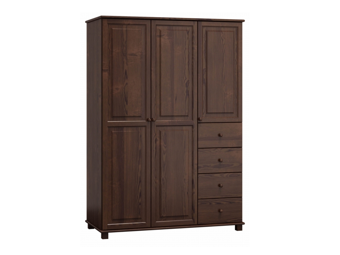 Tato skříň z masivní borovice s elegantním ořechovým mořením nabízí stylové úložné řešení. Čtyři šuplíky a prostorný šatní prostor zajišťují maximální komfort.