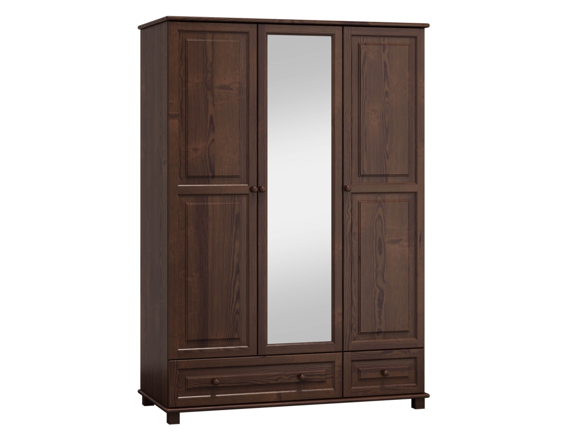 Skříň je opatřena zrcadlem, které opticky zvětšuje prostor a přidává na eleganci. Moření v odstínu ořech dodává skříni příjemný vzhled, který se snadno kombinuje s různými styly interiéru. Ať už máte moderní, klasický nebo rustikální styl, skříň 3D BHAGIRA 5 se stane jeho nedílnou součástí.
