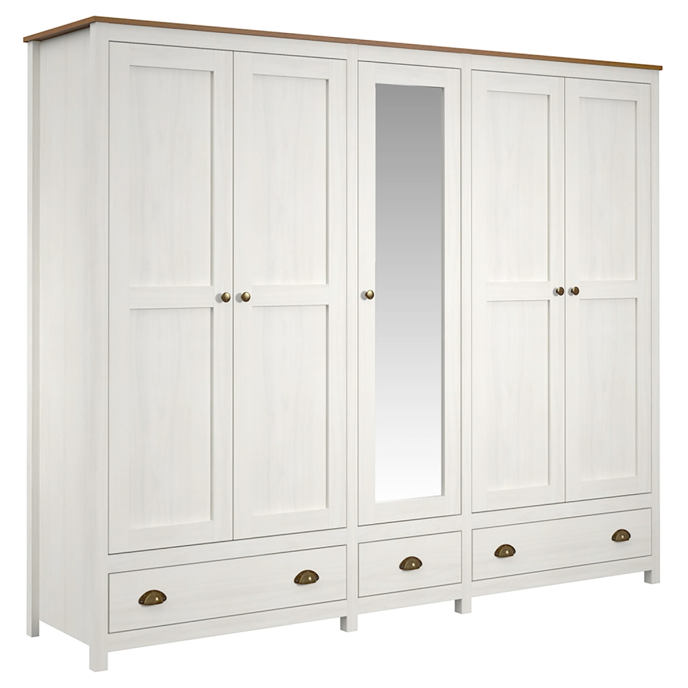 Skříň FEMI 5D je ideálním řešením pro ty, kteří hledají praktický a zároveň stylový kus nábytku. S rozměry 221 x 185 x 54 cm nabízí dostatek úložného prostoru pro všechny vaše oděvy a doplňky. Je vyrobena z masivu borovice, což zaručuje její dlouhou životnost a odolnost.