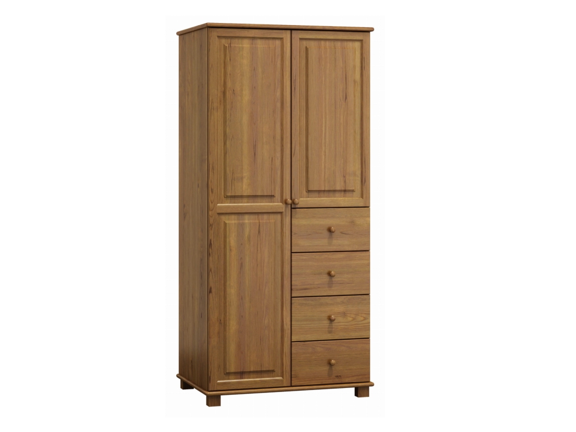 Kombinovaná šatní skříň je vyrobena z masivu borovice, což ji dodává nejen pevnost, ale také příjemný přírodní vzhled. Moření v odstínu dub přidává skříni na eleganci a dokonale se hodí do různých interiérů.