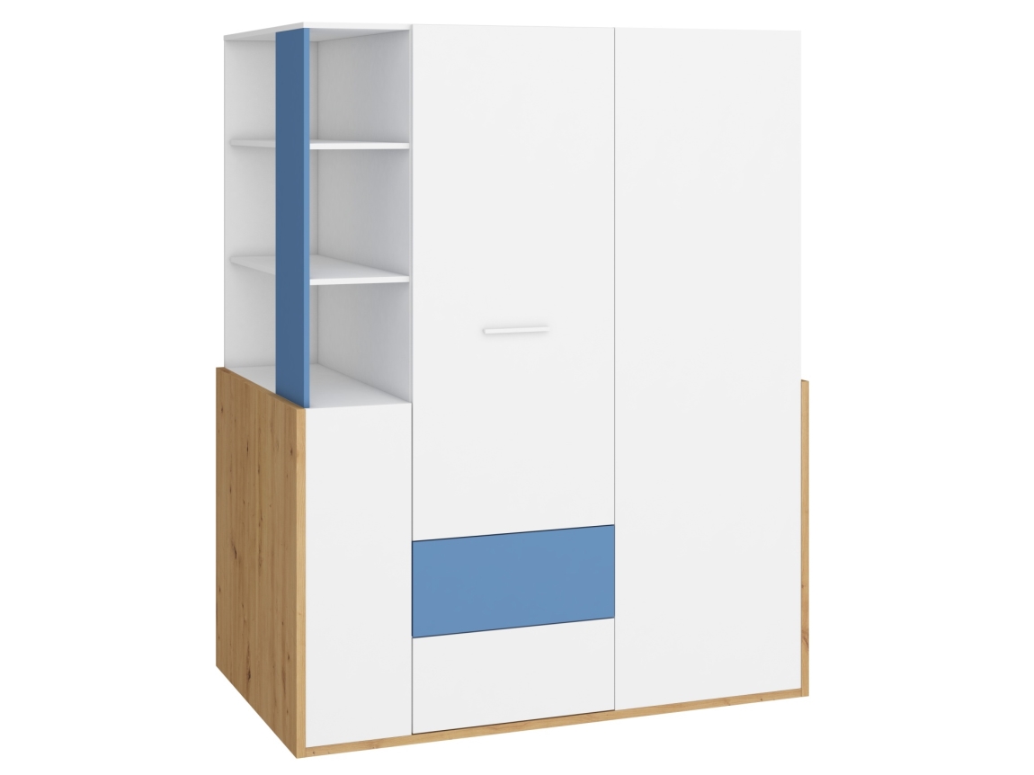 Skříň LEPON 155 je skvělým řešením pro ty, kteří hledají kombinaci stylu a funkčnosti. Její moderní design v atraktivní barevné kombinaci dub artisan, bílá a modrá se hodí do různých interiérů, od minimalistických po tradiční. S rozměry 155 x 195 x 96 cm je dostatečně prostorná, aby splnila vaše požadavky na úložný prostor.