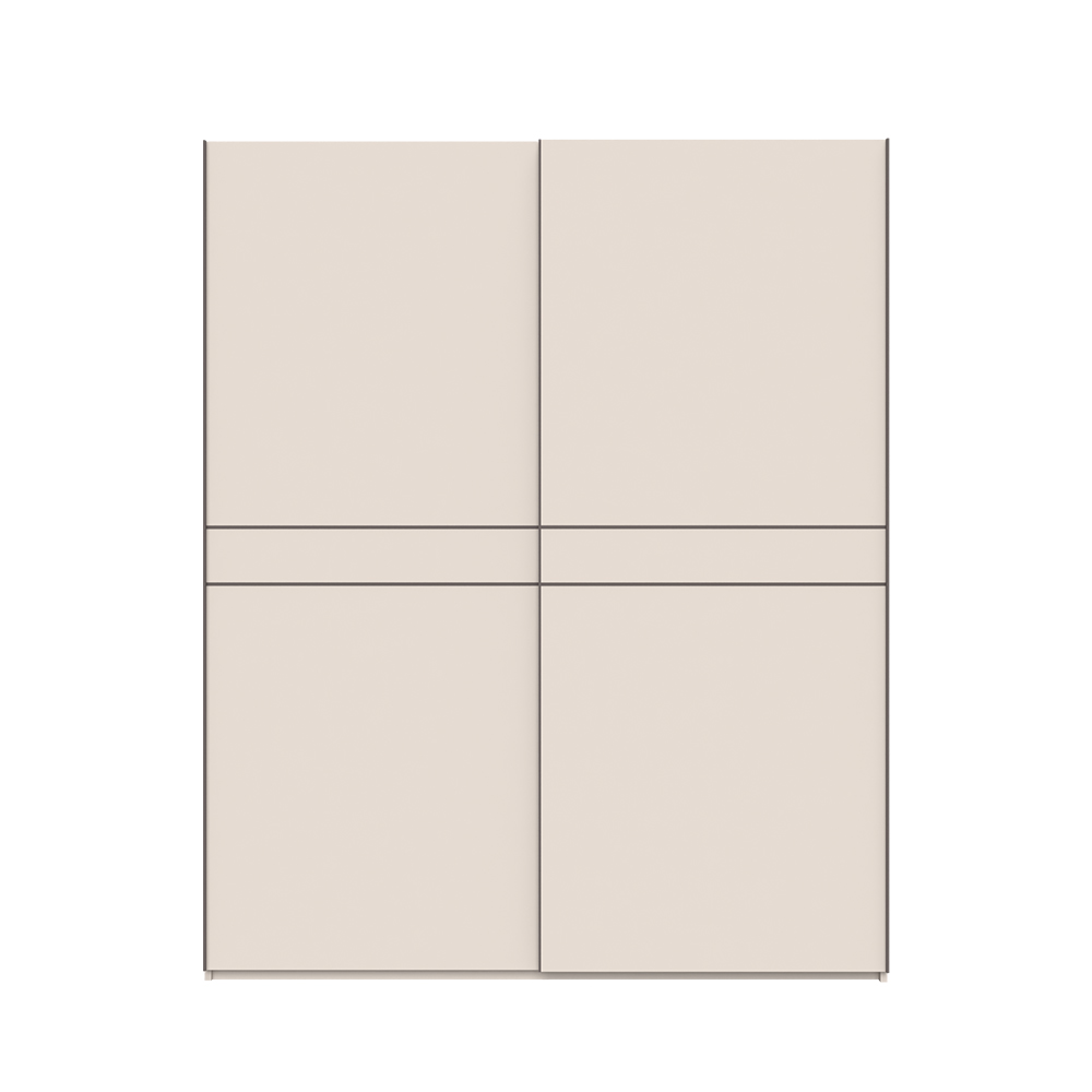 Korpus a boční strany skříně jsou pokryty měkkým matným UV lakem v barvě Cashmere, což dodává skříni moderní vzhled a zároveň zajišťuje odolnost. Přední strana skříně má tloušťku 18 mm a rovněž je opatřena stejným kvalitním lakem. Interiér korpusu je navržen v textilním dekoru, který přidává na atraktivitě a útulnosti.