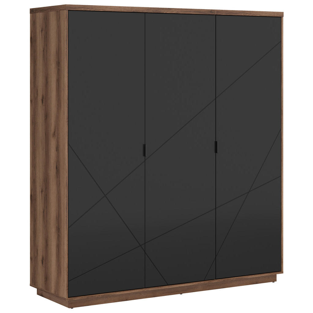 Tento model šatní skříně (typ S471-SZF3D-DDC/CAM) má rozměry 180 cm (šířka) x 201 cm (výška) x 57 cm (hloubka) a je vyroben z kombinace dřeva a MDF. Černá matná povrchová úprava je snadno udržovatelná a dodává skříni moderní vzhled. Tmavý dub přidává na eleganci a šarmu.