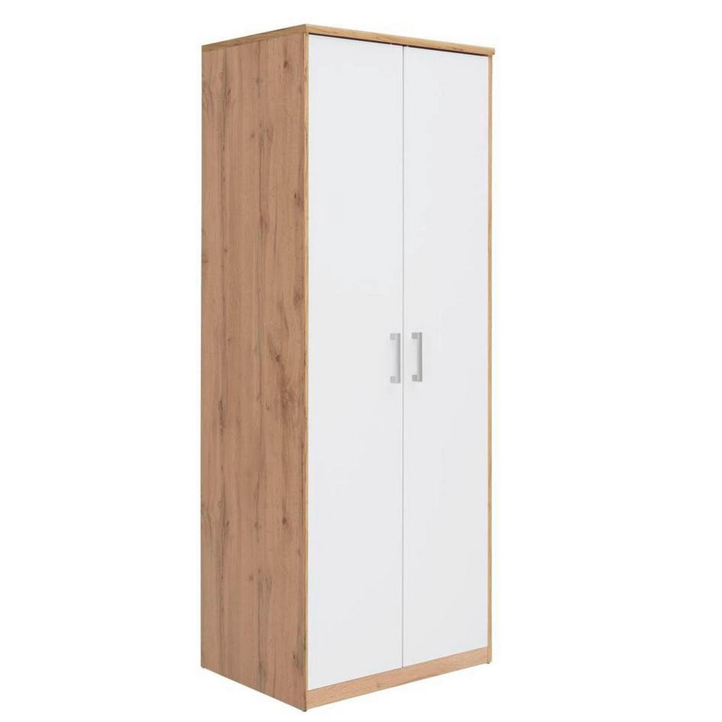 Tato dvoudvéřová skříň se skvěle hodí do chodby, ložnice nebo i dětského pokoje. Díky svému elegantnímu designu v kombinaci s bílou barvou a dekorem dubu wotan se snadno přizpůsobí různým stylům interiéru.