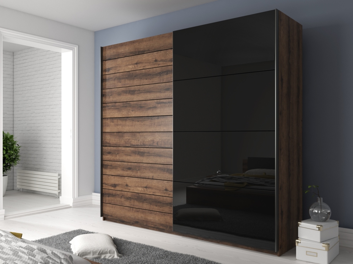 Dub monastery v kombinaci s černým leskem dodává skříni elegantní a nadčasový vzhled. Tento design se skvěle hodí do různých interiérů, ať už preferujete moderní, nebo klasický styl.